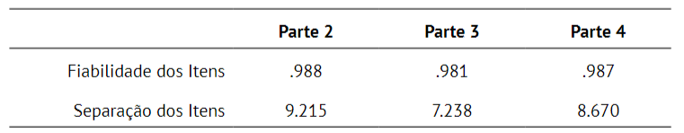 Os itens que compõem as 3 partes do QALA apresentam excelentes valores de fiabilidade e separação (Tabela 6), de acordo com os critérios definidos por Fisher (Tabela 1). Este aspeto é uma evidência importante da validade de construto e de replicabilidade do QALA.