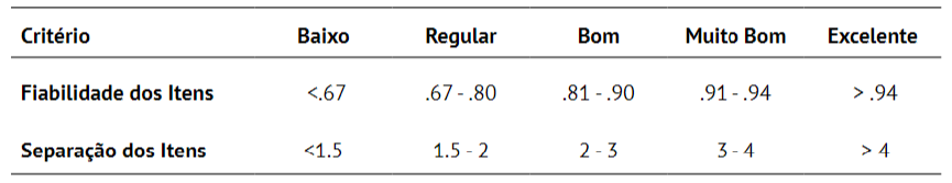 Índices de Fiabilidade e Separação dos Itens: Os índices de fiabilidade e separação dos itens referem-se, segundo Bond e Fox (2015), à capacidade do instrumento em definir uma hierarquia dos itens ao longo da variável (ou construto) medida. Dito de outra forma, estes índices revelam o quão bem os participantes separam os itens em diferentes níveis de dificuldade (Mofreh et al., 2014). Assim, os índices de fiabilidade e separação dos itens assumem uma especial relevância já que são indicadores da validade de construto (Linacre, 2020). Para um instrumento ser útil, o valor do índice de separação dos itens deve ser superior a 1,0 (Green & Franton, 2002) e os valores de fiabilidade dos itens deverão ser superiores a 0,50 (Mohamad et al., 2014). No entanto, quanto maiores forem os valores de ambos os indicadores, maior será também a confiança na replicabilidade do instrumento em outras amostras (Bond & Fox, 2015). Na tabela 1, apresentam-se os critérios de qualidade dos dois indicadores segundo a proposta de Fisher (2007).