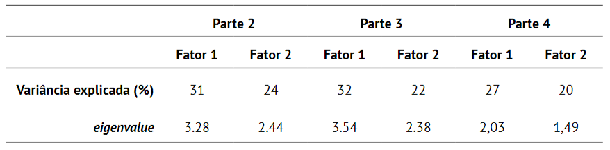 A tabela 2 revela que os dados das três partes do QALA apresentam valores concordantes com a unidimensionalidade, já que respeitam os critérios de percentagem de variância explicada do primeiro fator e o valor de eigenvalue do segundo fator.