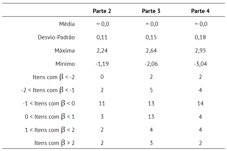 Uma síntese dos resultados de ajuste dos itens do QALA pode ser visualizada na Tabela 4. De um modo geral, verifica-se que a maioria dos itens que compõem o QALA foi respondida de acordo com o modelo esperado, com itens bem ajustados e com média próxima de 1,0. Ao nível do parâmetro WMS, a Parte 2 apresenta 19 (dos 20 itens), bem ajustados de acordo com o critério de Linacre (2002), tendo apenas 1 item com um desajuste moderado (WMS=1,70). Já todos os itens das Partes 3 e 4 encontram-se todos bem ajustados, ou seja, no intervalo de WMS entre 0,5 e 1,5. Relativamente ao UMS, os valores médios das 3 partes encontram-se igualmente próximos de 1,0. Na Parte 2, dois dos itens apresentam um desajuste moderado, estando os restantes bem ajustados. Na Parte 3, apenas 1 item apresenta um desajuste moderado, sendo inclusive o item com maior valor de β, o que pode ser revelador que alguns respondentes tenham respondido ao item ao acaso. Já a parte 4 apresenta 1 item com um ajuste pouco produtivo, estando os restantes bem ajustados.