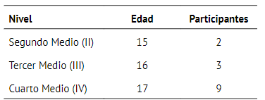 Por medio de una aproximación en cadena, se contó en definitiva con 14 estudiantes pertenecientes a enseñanza secundaria., con edades entre 15 y 18 años (Tabla 1), todos/todas miembros activos de movimientos sociales y de participación estudiantil a la fecha de entrevista. Todos/todas fueron considerados/as sin tener en cuenta su establecimiento educacional ni localización geográfica, razón por la cual se contó con estudiantes de distintas zonas de Chile.