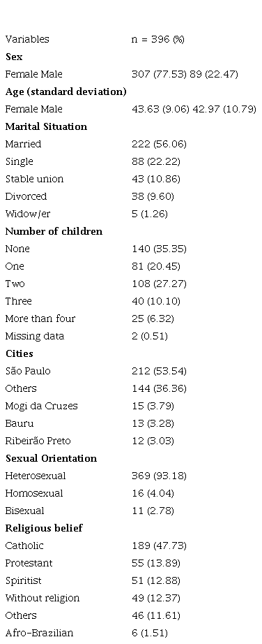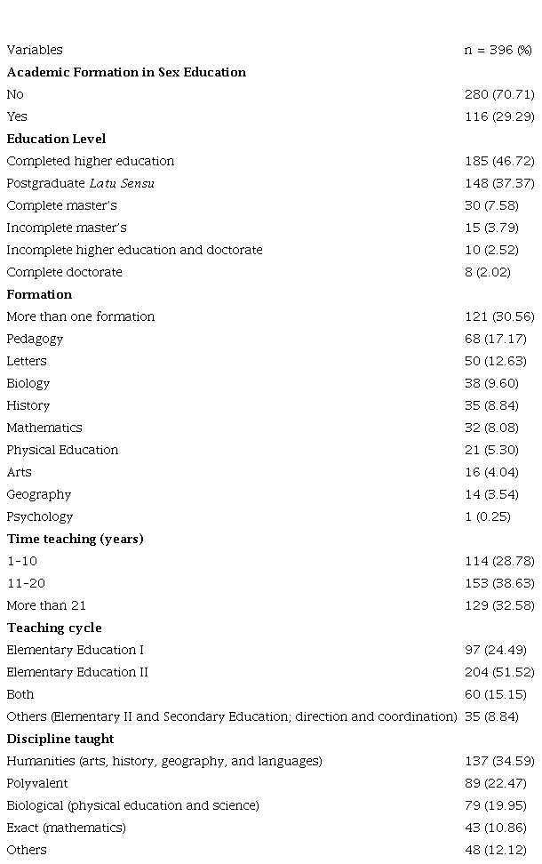 A total of 417 respondents participated in the data collection; however, 21 were excluded because they were high school teachers; thus, 396 participants were included. Table 1 outlines the sample’s sociodemographic variables.