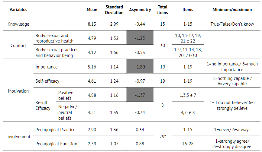 Table 3 displays the result of the socio-cognitive variables that comprise QUSES (Questionnaire on Sex Education in Schools), with the respective minima and maxima of each scale/subscale and corresponding factors.