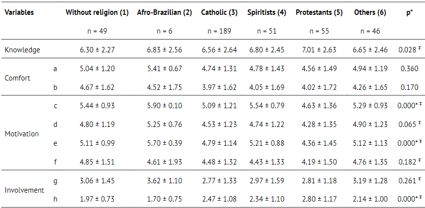 Regarding the teachers’ age, we found a weak correlation with all the QUSES variables. Table 4 shows the comparison of the means of the QUSES variables according to religious beliefs, which had an impact on the variables analyzed, with the exception of comfort.