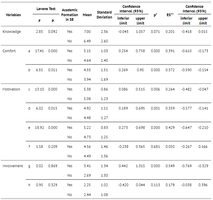 Table 5 exhibits the comparison between teachers according to their academic foundation in SE. No statistical difference was observed between knowledge, result efficacy (negative/neutral beliefs), and involvement in pedagogical function when considering teachers’ academic foundation in SE. For the other variables analyzed by QUSES (comfort, self-efficacy, result efficacy [positive beliefs], and involvement in pedagogical practice), this study found a statistically significant difference. However, having an academic foundation in SE did not significantly affect all the studied variables.