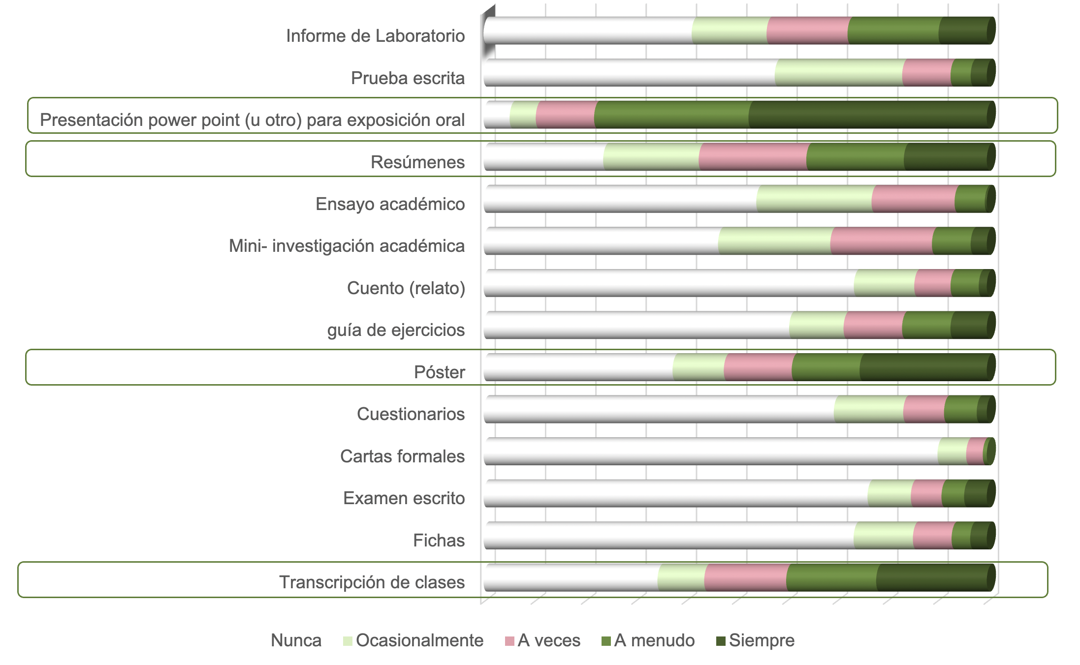 A continuación se presentan los resultados de los usos que declaran los estudiantes utilizar en sus escritos. en dos dimensiones: a) frecuencia de uso de recursos semióticos por géneros discursivos y b) frecuencia de artefactos multisemióticos, independiente del género discursivo, utilizados por estudiantes.