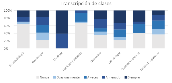 En el caso de la Transcripción de clases, es escasa la frecuencia de utilizar recursos semióticos en Fonoaudiología y Nutrición y Dietética. Por el contrario, en la carrera de Medicina, la totalidad de los estudiantes corrobora el uso de recursos semióticos en la Transcripción de clases.