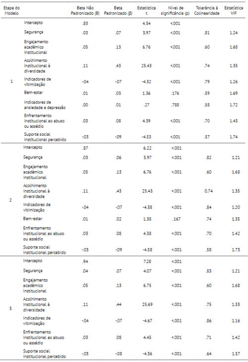 Ao longo do processo backward dois fatores variáveis foram excluídos do bloco sem alteração do percentual de variância explicada, que manteve R² de 56% (R² ajustado = 31,10%) para a explicação da ocorrência de respeito e não discriminação na universidade por meio dos seguintes fatores preditores: Segurança; Engajamento acadêmico institucional; Acolhimento institucional à diversidade; Indicadores de vitimização; Enfrentamento institucional ao abuso ou assédio; Suporte social e institucional percebido. Na Tabela 6, os modelos, abrangendo as três etapas, e as variáveis preditoras são apresentadas em maiores detalhes.
