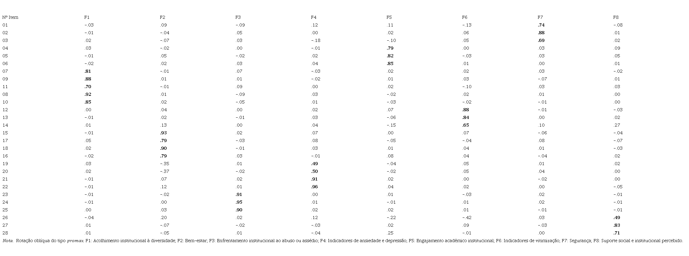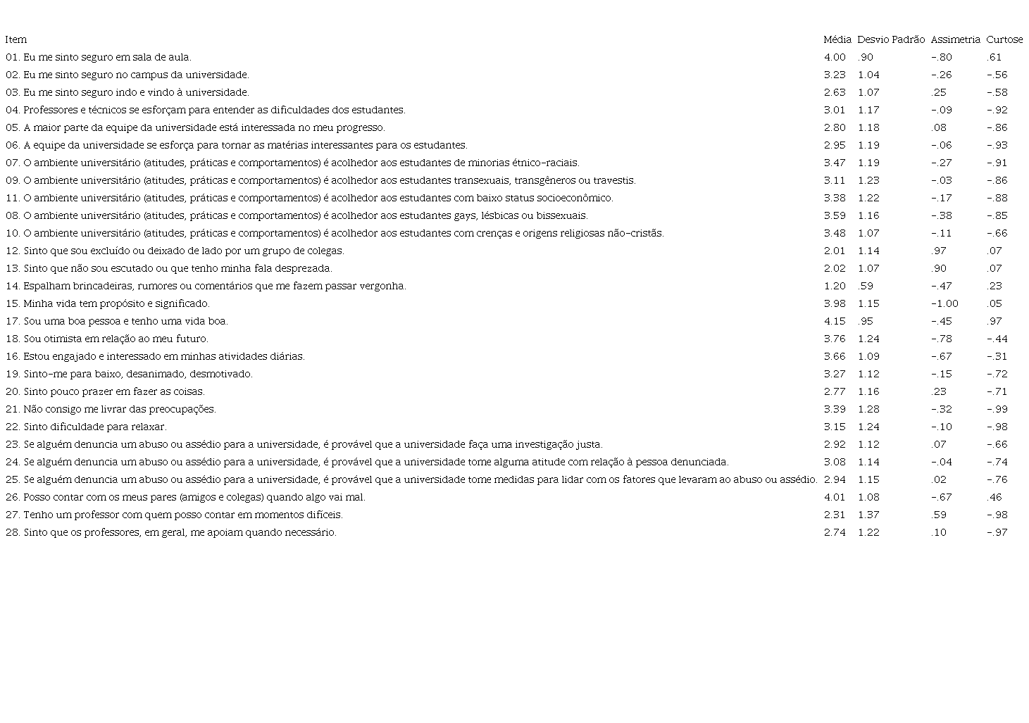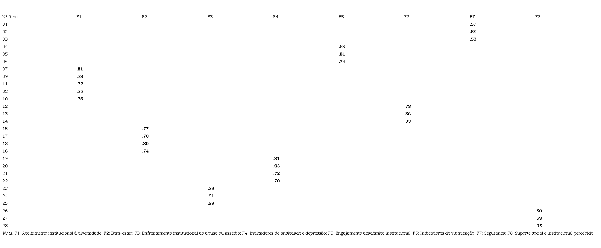 O sétimo fator foi nomeado “segurança” e refere-se ao quanto a instituição é percebida como um espaço seguro para conviver, estar e permanecer nos seus espaços e entornos (caminho de ir e vir) (Lenzi et al., 2017; Yano et al., 2021). O oitavo fator foi nomeado “suporte social e institucional percebido” e diz respeito ao quanto os sujeitos percebem apoio, cuidado, estima e ajuda na universidade, seja de amigos ou professores (Carvalho et al., 2011; Roza, 2018; Yano et al., 2021).