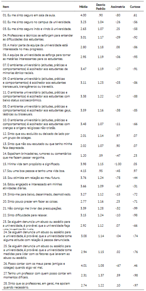 Cabe salientar que os indicadores Bem-estar; Indicadores de ansiedade e depressão não terem demonstrado relação significativa pode corroborar que esses fatores se apresentam mais distais das políticas e práticas institucionais que promovem a efetiva percepção de ações respeitosas e não discriminatórias na universidade (Casassus, 2002; Mitchell et al., 2016). Ao retomar a concepção de Clima Universitário apreende-se esta variável como nível macro de análise e inferência (Schneider et al., 2013). Portanto, o maior peso atribuído para os fatores que teorizam sobre a realidade institucional de forma expandida (Segurança; Engajamento acadêmico institucional; Acolhimento institucional à diversidade; Indicadores de vitimização; Enfrentamento institucional ao abuso ou assédio; Suporte social e institucional percebido) se adequa à proposta de avaliação em questão e estabelece evidências para que estudos futuros possam apreender se, de fato, aspectos próprios da dimensão individual (Bem-estar; Indicadores de ansiedade e depressão) devem ser mantidos e avaliados por meio de instrumentos que se propõem a compreender o Clima Universitário.