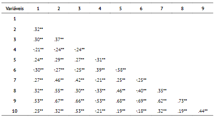 De modo geral, todas as correlações exploradas foram significativas ao nível de 0,05. Conforme detalhado na Tabela 5, analisando-se os fatores específicos, pode-se perceber validade convergente entre diferentes variáveis, como entre segurança e os indicadores de engajamento acadêmico institucional, bem-estar, enfrentamento institucional ao abuso ou assédio e suporte social e institucional percebido. Notou-se validade divergente entre alguns fatores, como entre engajamento acadêmico institucional e os indicadores de vitimização e indicadores de ansiedade e depressão.
