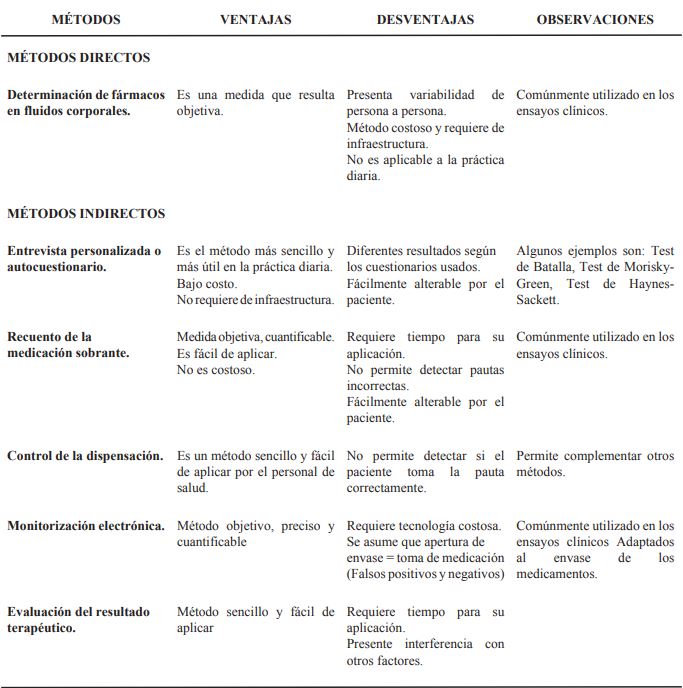 Estos métodos son costosos y limitados a ciertos fármacos pues no están disponibles para todos los medicamentos, resultando poco útiles para aplicarlos en la práctica clínica diaria, pues requieren una infraestructura adecuada24, además de obtener índices de incumplimiento más elevados que los métodos indirectos25.
