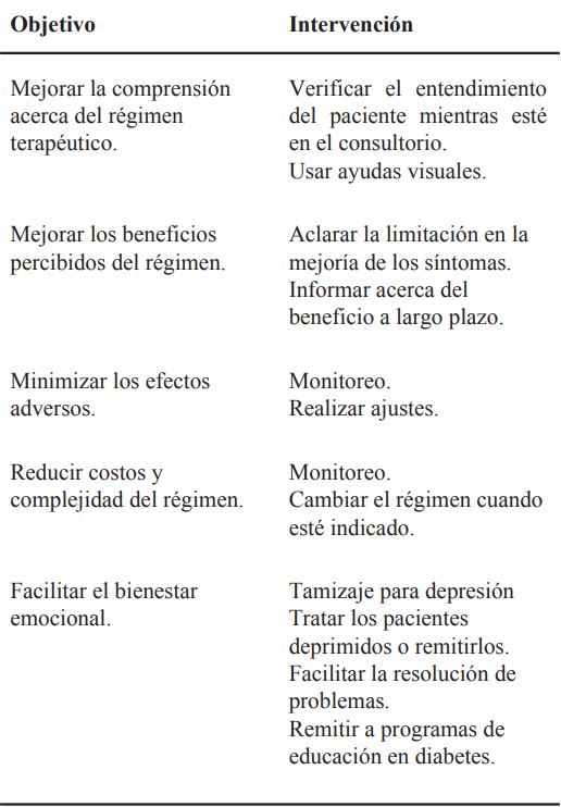 Se han estudiado varias estrategias para mejorar la adherencia en los pacientes con DM-2 43, cuyo objetivo fundamental es asegurar la comprensión acerca de la enfermedad y los beneficios esperados al seguir el tratamiento prescrito36,43,44. Estas estrategias deben ser fácilmente aplicables en el primer nivel de atención en salud45-47, y deben impactar a largo plazo, y de manera positiva, en la calidad de vida de los pacientes48.