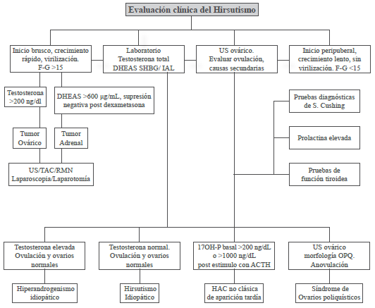 El perfil hormonal incluye la cuantificación sérica de la testosterona total, SHBG y DHEAS. La determinación de testosterona libre es 50% más sensible que la testosterona total pero es más costosa y no se encuentra disponible en muchos laboratorios. Con el valor de la SHBG se puede calcular el índice de andrógeno libre (IAL: 100T/ SHBG)17,18,19. Un valor basal de testosterona total > 200 ng/dL o DHEAS ≥ 600 μg/dL puede orientar hacia la búsqueda de una neoplasia ovárica o adrenal. Los adenomas adrenales pueden producir testosterona mientras que los carcinomas producen adicionalmente DHEAS. La administración de dexametasona suprime usualmente la concentración de DHEAS y cortisol en casos no neoplásicos pero nunca en los casos neoplásicos20. Estudios adicionales incluyen las pruebas de función tiroidea, prolactina y 17-OH-progesterona (17 OH-P) plasmática. Si se sospecha un síndrome de Cushing se debe realizar la cuantificación de cortisol libre urinario, pruebas de supresión con dexametasona o cuantificación del cortisol plasmático nocturno. Si la concentración basal de 17OH-P en fase folicular es mayor de 200 ng/dL debe realizarse la prueba de estimulación con ACTH (0,25 mg IV) con determinación de 17OH-P a los 0 y 60 minutos post estímulo para descartar hiperplasia adrenal congénita21. Un valor post estimulo ≥ 10 ng/dL es compatible con el diagnóstico de HAC no clásica22. Los casos de hirsutismo leve o moderado, hiperandrogenismo y anovulación crónica orientan hacia el diagnóstico de SOPQ.