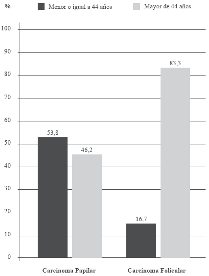 Se clasificó la muestra tomando en cuenta la edad promedio de presentación, en menores o iguales a 44 años y mayores de 44 años. Al asociar los grupos de edad con la variedad histológica del carcinoma tiroideo, se observa que un 83,3% de los pacientes con carcinoma folicular eran mayores de 44 años, con un riesgo 5,82 veces mayor de presentar carcinoma folicular los pacientes de este grupo, mientras que en los de menor edad (<44 años) predominó la variedad papilar en un 53,8% (Odds Ratio 5,82; IC95%: 1,23-27,43; p=0,013) (Fig.1).