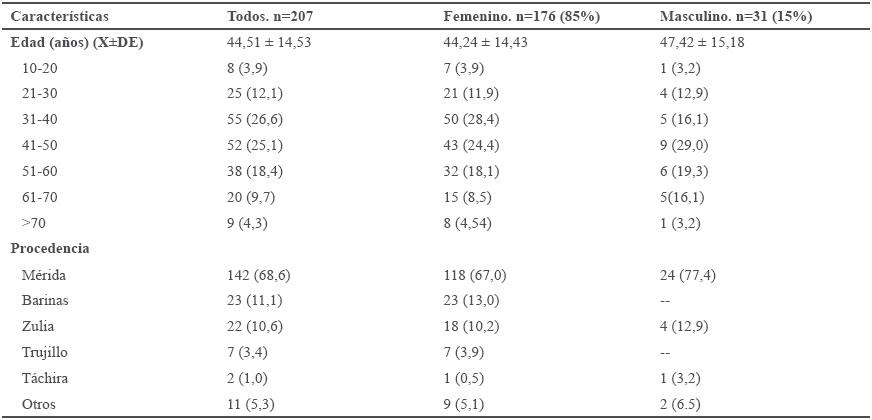 En total se revisaron 207 casos de carcinoma diferenciado de tiroides de los cuales 176 (85%) correspondieron al sexo femenino y 31 (15%) al sexo masculino; relación 6:1. Edad promedio 44,5 años ± 14,53 (12-81 años), el grupo etario más afectado en el sexo femenino fue el de 31 a 40 años, 50 pacientes (28,4%), mientras que para el sexo masculino fue el de 41 a 50 años, 9 pacientes (29%). La procedencia fue mayor del Estado Mérida 142 (68,6%) debido a la ubicación del centro asistencial en esta entidad (Tabla I).