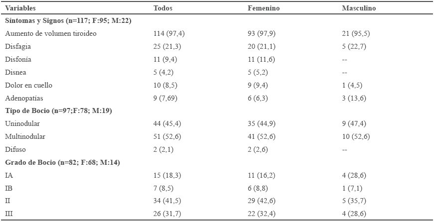 De 117 pacientes, la manifestación clínica inicial más frecuente fue el aumento de volumen en cara anterior de cuello 114 (97,4%), sin diferencia entre sexos, mientras que el segundo síntoma fue distinto entre los sexos: la disfagia presente en 20 (21,1%) de los casos femeninos y adenomegalias presentes en 3 (13,6%) de los casos masculinos. De 97 casos que tenían disponible la información, el 52,6% se presentó con bocio multinodular (BMN) y el 45,4% con bocio uninodular, sin diferencia por sexo. El grado II fue el tamaño de bocio más común para ambos sexos, 29 (42,6%) en el sexo femenino y 5 (35,7%) para el sexo masculino (Tabla II).