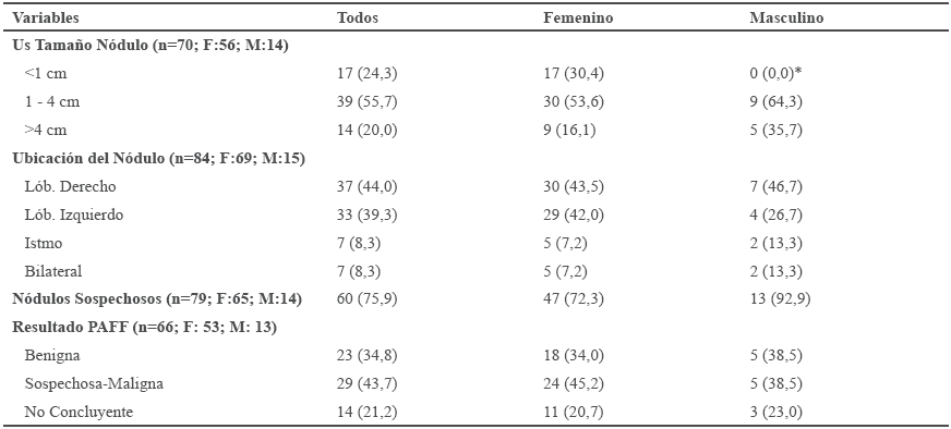 El resultado de ultrasonido estuvo disponible en 96 pacientes, de los cuales 39 (55,7%) presentaba tamaño del nódulo entre 1 y 4 cm, sin diferencia significativa entre los sexos. Es de hacer notar que los nódulos menores de 1cm sólo fueron reportados en el sexo femenino con diferencia significativa (p=0,036). La ubicación de los nódulos fue mayor a nivel lobar (83,3%) sin predilección por alguno de los lóbulos y sin diferencia por sexo. Se observó que 60 casos (75,9%) presentaron nódulos sospechosos (nódulo > 1cm de diámetro, hipoecogénico, ausencia de halo periférico, con microcalcificaciones, vascularización central al doppler y/o de bordes irregulares)2,3,4,5,27. El resultado de la PAFF estuvo disponible en 66 pacientes y fue positiva, incluyendo sospechoso y maligno, en el 43,7% de los casos, el 34,8% resultó benigna y 21,1% no concluyente (Tabla III).