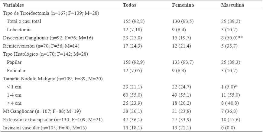 De 167 casos, se practicó tiroidectomía total en 155 (92,8%), la disección ganglionar fue realizada en 23 (25%), con predominio en el sexo masculino 8 (50%) de los casos (p<0,01). De 70 pacientes, 17 (24,3%) ameritaron reintervención. De 109 casos, en 60 (55%) el tamaño del nódulo maligno fue descrito de 1-4 cm; en el sexo masculino los nódulos fueron de mayor tamaño que en el sexo femenino con diferencia significativa (p<0,05).