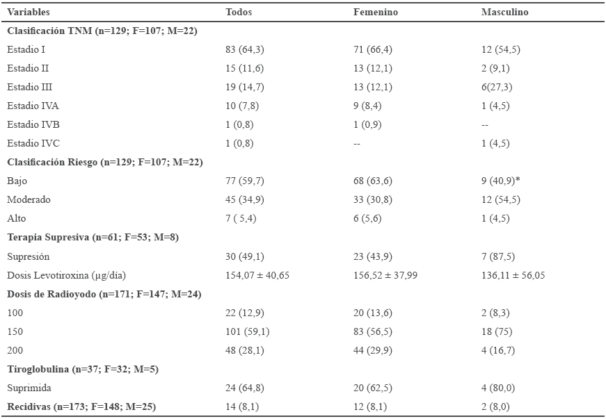 En 129 casos se clasificó el estadio de acuerdo al TNM y el riesgo de recurrencia según ATA después de la cirugía, con los siguientes resultados: 83 (64,3%) se encontraban en estadio I, 15 (11,6%) estadio II, 19 (14,7%) estadio III, 10 (7,8%) estadio IVA, 1 (0,8) estadio IVB y 1 (0,8%) estadio IVC, sin diferencia significativa entre sexos. El riesgo de recurrencia fue bajo en la mayoría de los casos 77 (59,7%), moderado en 45 (34,9%) y alto en 7 (5,4%), sin embargo el sexo masculino presentó una significativa mayor frecuencia de riesgo moderado con respecto al sexo femenino (54,5% vs 30,8%; p<0,05). De 61 casos se logró supresión de TSH en 30 (49,1%) y la dosis utilizada de levotiroxina fue de 154,07μg ± 40,65. De 207 pacientes a 171 (82,6%) se les dio tratamiento con I131, la dosis más utilizada fue 150 μCi en 101 (59,1%). De 37 pacientes, se logró la supresión de la tiroglobulina en 24 (64,8%). De 173 casos, las recidivas solo se presentaron en 14 (8,1%) sin diferencia entre los sexos (Tabla V).