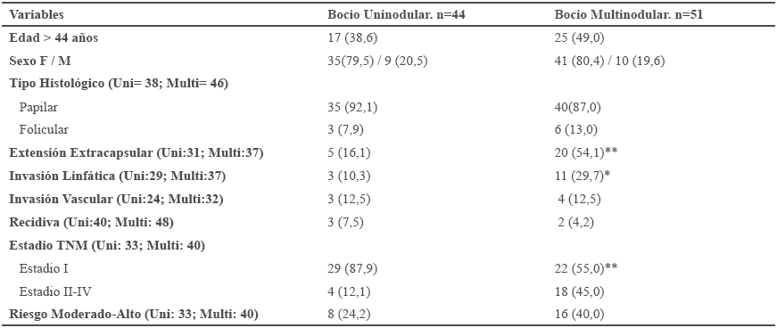 Results: A total of 207 records were reviewed, the female sex was the most affected (6:1 ratio), the average age was 44.5 years, and the most affected age group was 31 to 40 years. The most important symptom was the increase in volume in the anterior neck in 97.4%. Total thyroidectomy was performed in 92.8% of the cases. The most frequent histological variety was papillary, 92.9%. Goiter was multinodular in 52.6%, and compared to uninodular, it ocurred at an older age and showed a significantly higher frequency of extracapsular extension, lymphatic invasion and more advanced TNM stages. The 59.7% had low risk of recurrence. Patients with moderate-high risk were older and had an increased risk of extracapsular extension and lymph node metastases (p <0.0001).