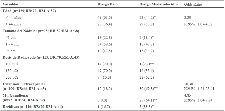 Al comparar las características de pronóstico con el nivel de riesgo según ATA se encuentra que en 129 pacientes, el 55,8% de los mayores de 44 años presentaban riesgo moderado o alto de recurrencia, mientras que el 63,6% de los menores de 44 años presentaban bajo riesgo; la posibilidad de presentar moderado o alto riesgo de recidiva fue 2,2 veces mayor si el paciente era mayor de 44 años (Odss Ratio 2,2; IC95%: 1,07 a 4,52; p <0,05). En 95 pacientes estuvo disponible el tamaño tumoral, el riesgo moderardo-alto se asoció con mayor tamaño del nódulo (1-4 cm y más de 4 cm; p<0,05). La dosis de I131 estuvo disponible en 115 pacientes y esta fue superior en los pacientes con moderado y alto riesgo de recurrencia, sólo 1 paciente clasificado como riesgo moderado-alto recibió dosis de 100 uCi de I131, mientras que 14 (20,0%) de los de bajo riesgo recibieron esta dosis; la dosis de 150 uCi de I131 fue administrada a 49 (70%) pacientes de bajo riesgo y a 16 (35,6%) pacientes con riesgo moderado-alto; la mayor dosis, 200 uCi de I131 fue administrada a 7 (10%) pacientes clasificados como bajo riesgo y a 28 (62,2%) pacientes de riesgo moderado-alto (p<0,0001). En 109 pacientes se asoció la extensión extracapsular con el riesgo de recidiva, encontrando que un 69,8% de los pacientes de moderado y alto riesgo presentaban extensión extracapsular, mientras que sólo el 18,2% de los pacientes de bajo riesgo presentaba dicha complicación; así los pacientes clasificados como de moderado y alto riesgo presentaban 10,38 veces más riesgo de extensión extracapsular (Odds ratio 10,38; IC95%: 4,21-25,61; p=0,0001). En 93 casos se realizó la asociación entre el riesgo de recurrencia y la presencia de metástasis ganglionar, el 100% de los pacientes de bajo riesgo no presentaron metástasis ganglionar, mientras que el 64,1% de los pacientes clasificados con moderado y alto sí las presentaron; se evidenció 4,85 veces más riesgo de presentar metástasis ganglionares en los grupos de moderado y alto riesgo (Odds Ratio: 4,85; IC95%: 3,04-7,74; p=0,0001). De 116 pacientes que tenían disponible la información, hubo solo 6 casos de recidiva del CDT, 5 de los cuales estaban clasificados con riesgo moderado-alto (p<0,05) (Tabla VII).