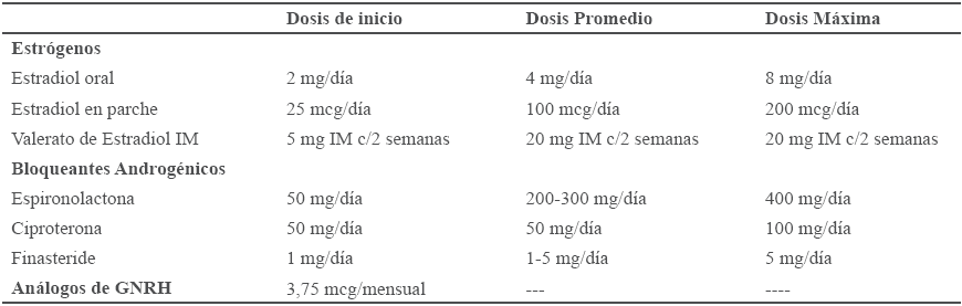 La evaluación endocrinológica implica una buena anamnesis, con antecedentes patológicos y familiares, hábitos psicobiológicos y toxicológicos, examen físico completo y paraclínicos, que incluyan perfil metabólico y hormonal (evaluación del eje hipotálamo-hipofisis-gonadal). El endocrinólogo tiene un papel determinante en el régimen farmacológico antes y después del procedimiento quirúrgico, siempre y cuando el paciente cumpla con una serie de requisitos como ser mayor de edad, conocimiento de los efectos adversos de la terapia hormonal, experiencia de vida real con sexo decidido por lo menos 3 meses y salud mental estable5,6. La transición médica consiste en el uso de terapia hormonal para inducir características sexuales secundarios que afirmen el fenotipo deseado, al mismo tiempo que supriman los niveles hormonales endógenos del individuo. Para transexuales masculinos usualmente se requiere el uso de testosterona mientras que en transexuales femeninas son típicamente usadas combinaciones de estrógenos con bloqueantes androgénicos o análogos de GnRH7,8.