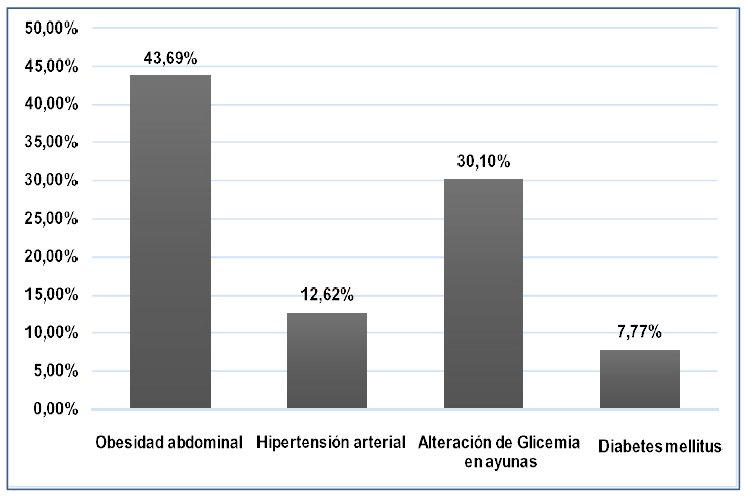 La prevalencia de obesidad abdominal fue de 43,69%, de hipertensión arterial