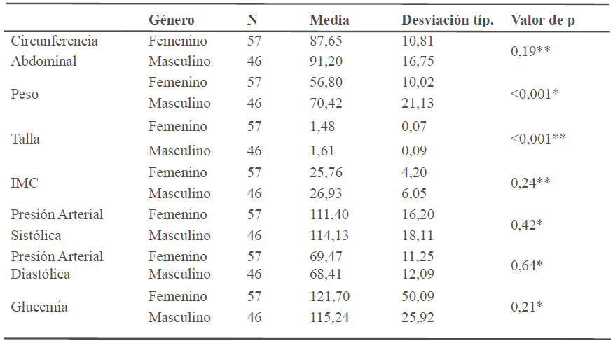 La circunferencia abdominal fue mayor en el género masculino que en el femenino