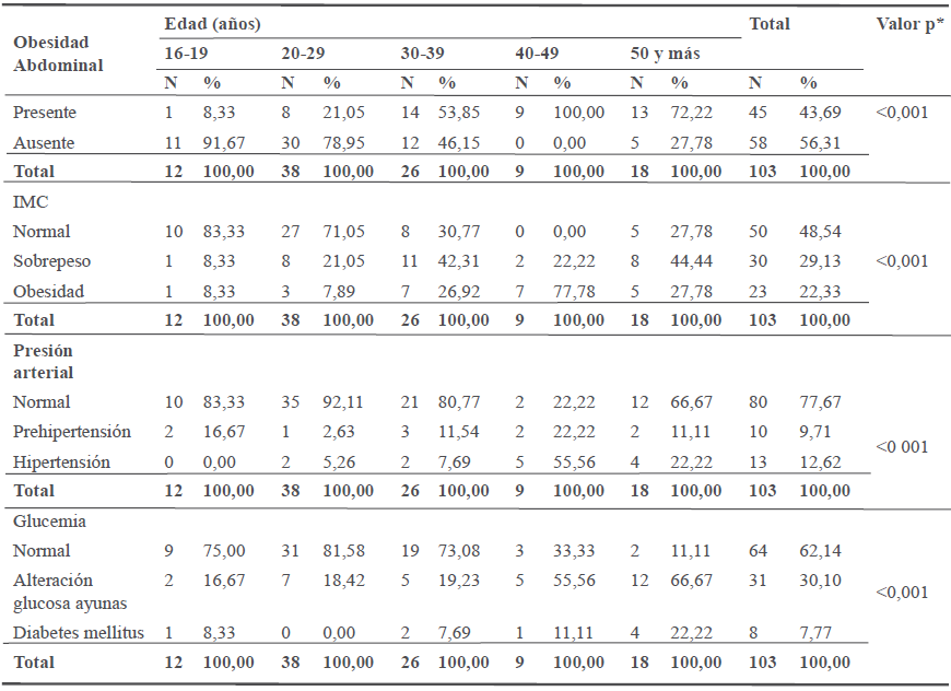 La prevalencia de obesidad abdominal según la edad fue mayor en el grupo de 40-49 años donde todos tenían este trastorno (100%), seguido de los de 50 y más años con 72,22%. El sobrepeso fue más prevalente en los individuos con 50 años y más con 44,44%, seguido de los de 30-39 años con 42,31%; la obesidad fue mayor en indígenas de edades de 40-49 años con 77,78% seguido de los de 50 y más años con 27,78%. Del mismo modo la hipertensión arterial fue más prevalente en individuos de 40-49 años con 55,56% seguido de mayores de 50 años con 22,22%. La alteración de glucemia en ayunas en general fue 66,67% siendo el grupo de pacientes con 50 años o más, frecuentemente afectado. Cabe destacar que estos hallazgos fueron significativamente estadísticos p˂0,01 (Tabla III).