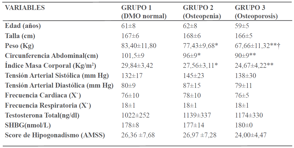 Datos en X±DE. ANOVA *p < 0,05 **p < 0,001 vs Grupo 1. † p <0,05 vs Grupo 2; AMSS: Aging Males Symptoms