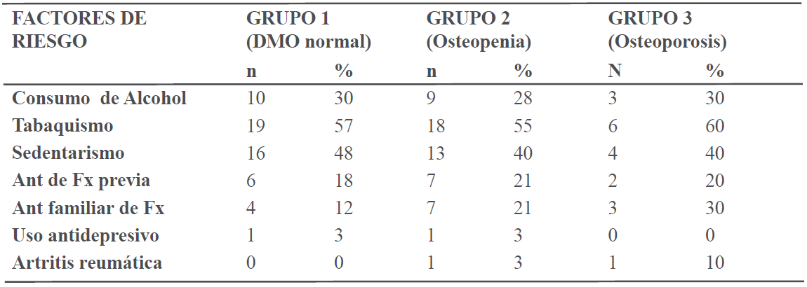 Entre los factores de riesgo estudiados, predominaron el tabaquismo, el sedentarismo y el consumo de alcohol. No se encontró una diferencia significativa entre los grupos de alteración de la DMO y la presencia de factores de riesgo para osteoporosis. No hubo casos de hipogonadismo ni de consumo de glucocorticoides (Ver tabla II).
