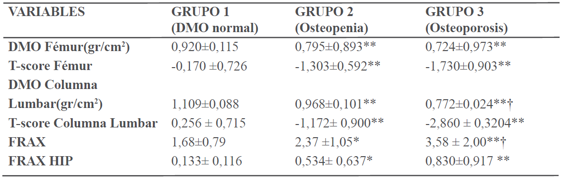 Las variables continuas se presentan en promedio ± desviación estándar y las categóricas en número absoluto y porcentajes. Se estableció el número y porcentaje de pacientes que cumplieron con los criterios diagnósticos de osteopenia y osteoporosis, y se compararon con los sujetos normales mediante la aplicación del Chi2 o test de Fisher. Para la comparación de promedios se aplicó el t-student y el ANOVA. Se aplicó una matriz de correlación de Pearson entre las variables cuantitativas. Se utilizó el programa SPSS versión 19 para Windows. El nivel de significancia empleado fue una p <0,05.