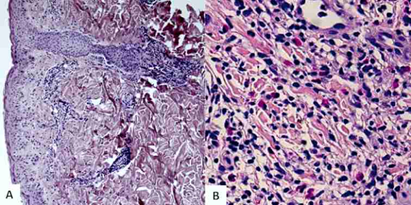 El examen físico era normal, con evidencia de lesión en forma de placa eritematosa de color uniforme de aproximadamente 4 centímetros de diámetro ubicada en el hombro derecho (figura 1). El resto del examen físico y la ecografía pélvica estaban dentro de límites normales. No se encontraron otros síntomas sistémicos asociados, sugestivos de condiciones autoinmunes. Las pruebas de laboratorio, incluida hematología completa, funcionalismo renal y hepático, electrolitos y glucemia en ayunas, estaban normales. Las pruebas de coagulación, función tiroidea y de detección de enfermedades autoinmunes no mostraron anomalías. La concentración de progesterona fue 12 ng/mL durante la fase lútea. La biopsia de la zona eritematosa demostró dermatoepidermitis con hemorragia dérmica intersticial, infiltración de linfocitos perivasculares y presencia de eosinófilos, sin otras alteraciones (figura 2). El análisis de inmunofluorescencia directa de la zona perilesional fue negativo.