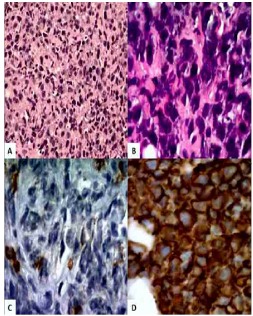 Evaluación histológica de la biopsia de glándula suprarrenal. A) Células pequeñas azules con escaso citoplasma eosinofílico núcleos grandes irregulares hipercromáticos (coloración hematoxilina-eosina, 100X). B) Células con 2-3 nucleolos prominentes con varios cuerpos apoptóticos (coloración hematoxilina-eosina 400X) C) Coloración inmunohistoquímica positiva para el antígeno común de leucocitos (200X). D) Coloración inmunohistoquímica positiva y difusa para el marcador CD20 en la membrana y citoplasma (200X)