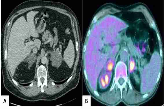 Imágenes posteriores al tratamiento con quimioterapia. A) Imagen de tomografía computada que muestra tejido suprarenal cicatrizal con aparente remisión completa del linfoma. B) Imagen de tomografía por emisión de positrones que muestra glándulas suprarrenales metabólicamente activas y de tamaño cercano al normal.
