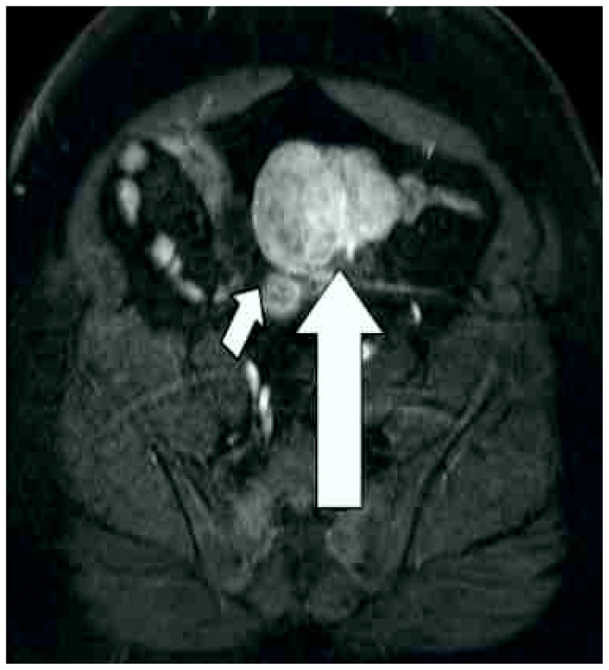 La ecografía pélvica mostró útero normal con grosor endometrial de 3 milímetros y tumor de ovario izquierdo sólido bien definido con escaso líquido ascítico en fondo de Saco de Douglas. El anexo derecho estaba normal. La resonancia magnética abdominopélvica reveló riñones y glándulas suprarrenales normales y tumor sólido de 8 x 6 centímetros en el ovario izquierdo, heterogéneo y con alta vascularización, rodeado de folículos ováricos normales (figura 1). No había evidencia de tumor suprarrenal o en otra ubicación, metástasis, líquido ascítico, linfadenopatías retroperitoneales o pélvicas. Los valores de marcadores tumorales (gonadotropina coriónica, CA-125, CA19-9, antígeno carcinoembrionario y alfafetoproteína) estaban dentro de límites normales. En vista de las concentraciones séricas elevadas de testosterona y los hallazgos de la resonancia magnética, fue considerada la posibilidad de tumor de células del estroma del cordón sexual de ovario productor de testosterona, por lo que fue programada para cirugía.