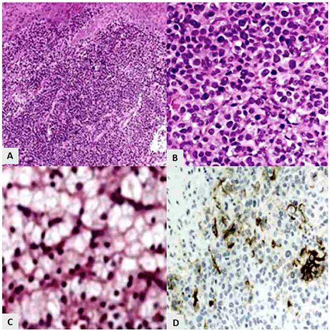 (A) Patrón de crecimiento difuso con dos tipos de células eosinofílicas y células claras (Coloración hematoxilina-eosina). (B) Células eosinofílicas con abundante citoplasma granular eosinofílico y pequeños núcleos (Coloración hematoxilina-eosina). (C) Células claras vacuoladas con pequeños núcleos (Coloración hematoxilina-eosina). (D) Inmunotinción positiva difusa para inhibina