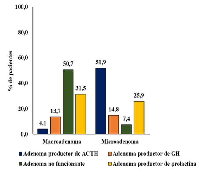 Según la bibliografía, los microadenomas son más prevalentes e incidentes que los macroadenomas, los cuales presentan una prevalencia del 0,16 al 0,2%6,14; sin embargo, en nuestro trabajo obtuvimos que la mayoría resultaron ser macroadenomas (73%); los microadenomas predominaron entre los pacientes con AP-ACTH y prolactinomas, y los macroadenomas entre aquellos con A-NF, entendiendo que en nuestra investigación los A-NF fueron los adenomas con más número de casos y que tales pacientes acudieron a consulta principalmente cuando presentaron los síntomas de efecto de compresión quiasmática y cefalea, al igual que lo reportado en la bibliografía7,11.