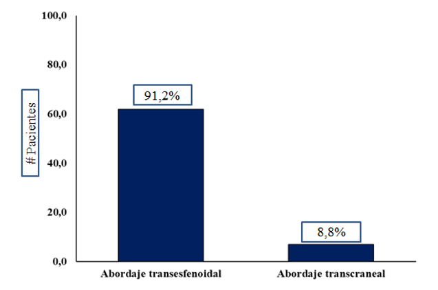 Cuando se relacionó el tipo de tratamiento con cada tumor (Tabla III), de todos los tratamientos médicos, 21 (65,5%) correspondió a AP-PRL (p=0,001), mientras que de todos los casos donde el tratamiento fue quirúrgico, en 16 (72,7%) el tumor fue AP-ACTH; y los casos donde se recibió tratamiento médico-quirúrgico, 30 (65,2%) fueron A-NF. El abordaje transesfenoidal predominó en el 91,2% de los casos quirúrgicos (Figura 2).