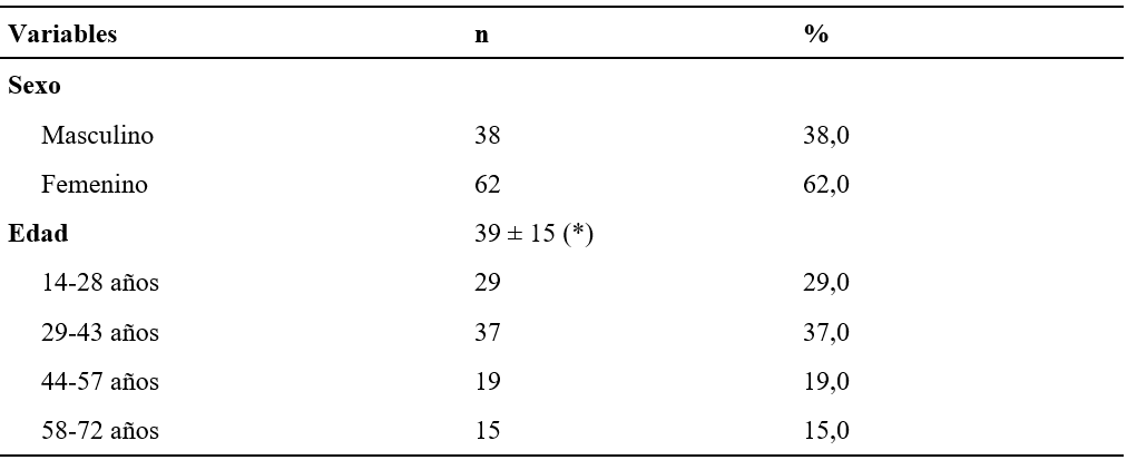 Fueron evaluados de manera retrospectiva 102 pacientes con diagnóstico de tumor hipofisario, de los cuales 100 se analizaron estadísticamente, donde la mayoría de estos pacientes fueron del sexo femenino, 62%; en cuanto a la edad, la mayoría, 37% con edad entre 29-43 años, y el menor grupo fue de 15 pacientes entre 58-72 años. La edad promedio de estos pacientes fue 39 ± 15 años (rango: 14 – 72 años) (Tabla I).