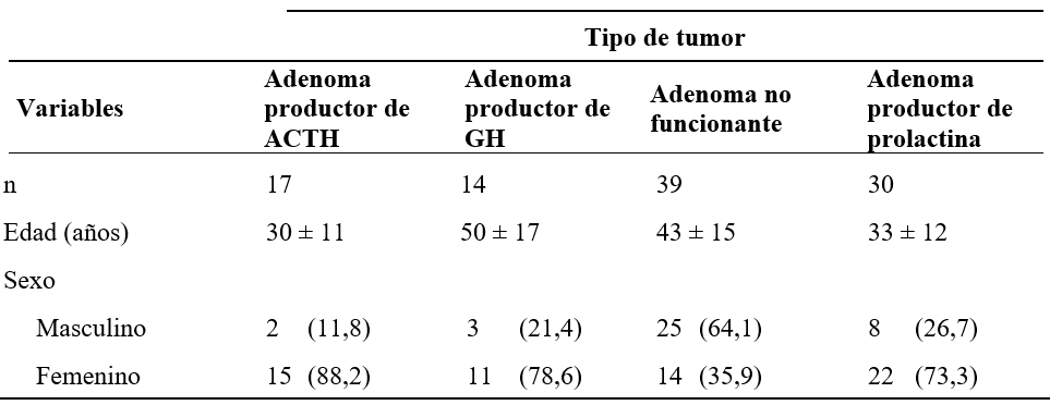 Methods: A descriptive and retrospective study was realized. The population and sample consisted of 102 patients with pituitary tumors: 17 producers of ACTH, 14 of growth hormone, 30 of prolactin, 39 non-functioning, one of TSH and one of FSH / LH. Age, sex, clinical and biochemical manifestations, size of adenoma according to MRI, established treatment, complications, tumor recurrence and histopathological characteristics were included.