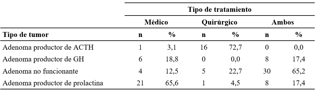 Resultados: De los 100 casos incluidos en el análisis estadístico, el sexo femenino fue el más frecuente (62%), y el promedio de edad fue de 39±15 años. El tumor no funcionante fue el más encontrado, seguido del productor de prolactina. Los macroadenomas predominaron en los tumores no funcionantes y los microadenomas en los productores de ACTH. El tratamiento médico fue la primera alternativa y donde la elección fue quirúrgica, la cirugía transesfenoidal fue la más utilizada. Los tumores no funcionantes fueron adenomas gonadotropos y mixtos posterior a la inmunohistoquímica.