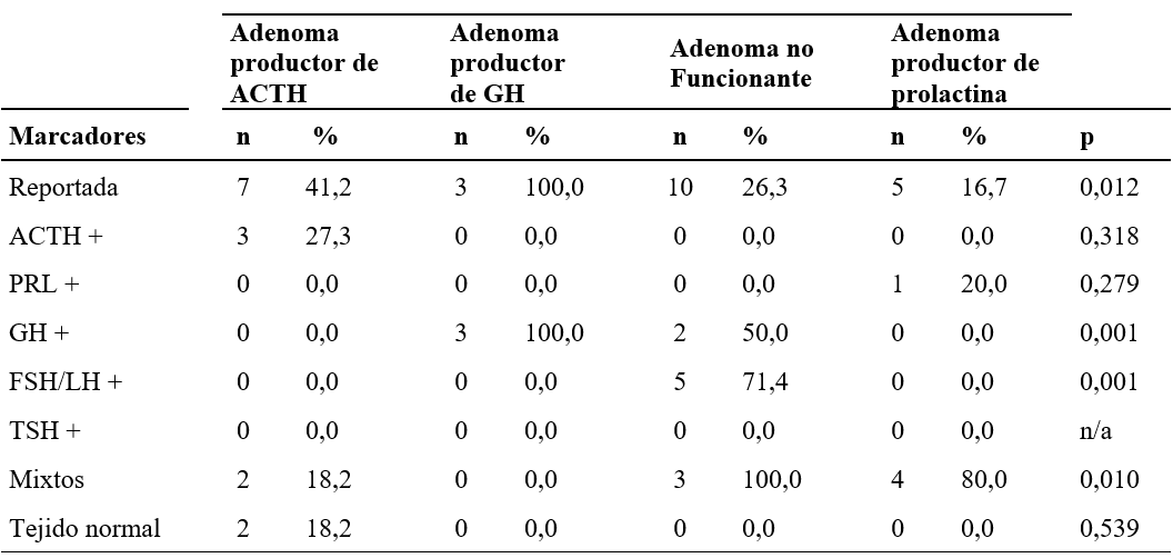 En los marcadores de inmunohistoquímica, hubo diferencias en FSH/LH+, ya que fue evidente solo en los casos de A-NF (p=0,001). También hubo diferencia en Mixtos, 80% en AP-PRL (p=0,050). En AP-ACTH, sólo estuvo el marcador ACTH+ en el 27,3%, mixtos en el 18,2% y tejido normal reportado en el 18,2%. El marcador de GH+ estuvo en AP-GH y A-NF (p=0,001) (Tabla IV).