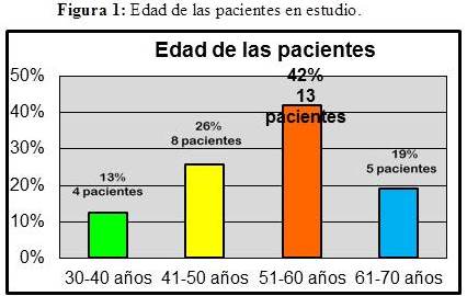 El grupo prevalente de edad con un 42 % está entre los 51 y 60 años. Nótese como un 13 % de las pacientes están en el grupo etario menor de 40 años.