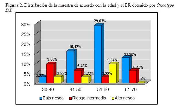 La distribución de los grupos de riesgo en las pacientes estudiadas, mostró que un 61 % tuvieron bajo riesgo, un 23 % intermedio y un 16 % alto. Estos resultados permitieron la selección de tratamientos de quimioterapia para las pacientes con ER alto y hormonoterapia para los de ER bajo. En las pacientes con ER intermedio, características como alto grado, invasión linfo-vascular presente, Ki67 elevado, baja concentración de receptores hormonales, orientó el tratamiento hacia la quimioterapia, caso contrario, las pacientes recibieron tratamiento con hormonas. Con un 42 % el grupo etario entre 51 y 60 años es el que presentó con más frecuencia la enfermedad. La estadística general del cáncer de mama en nuestro país, presenta la mayor incidencia de la enfermedad después de los 50 años, sin embargo, se ha observado una clara tendencia a que la enfermedad se presente en mujeres más jóvenes, en nuestro trabajo un 13 % de las pacientes se encuentra en el grupo etario entre 30 y 40 años. Llama la atención como la posibilidad de tener un ER alto se presenta en todos los grupo, excepto en mujeres mayores de 61 años, es una información importante a considerar en cuanto a la necesidad de indicar la prueba Oncotype, en pacientes de este grupo etario, que adicionalmente presenta características histológicas e inmunohistoquímicas de buen pronóstico, como buen grado de diferenciación y alto porcentaje de receptores hormonales, baja expresión del Ki67 y ausencia de invasión linfo vascular, por ejemplo. A diferencia de lo que tradicionalmente ha manejado la comunidad médica mastológica, no todas las pacientes jóvenes son de alto riesgo tributarias de tratamiento de quimioterapia o las de mayor edad con menor riesgo se benefician más del tratamiento hormonal, vemos como en el grupo de mujeres más jóvenes, un 3,22 % presentan RS bajo, y recibieron tratamiento hormonal, sin embargo, debemos apreciar, como en general la distribución de diferentes resultados de ER fue variada en todos los grupos de edad, excepto, al menos en nuestra serie, en el grupo de más de 61 años, donde no hubo ER alto.
