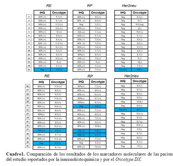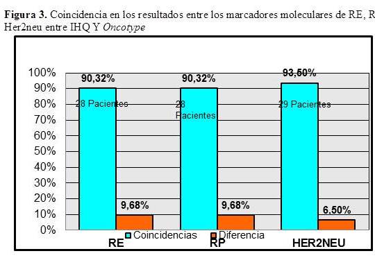 Se aprecia una 90,32 % de coincidencia en los resultados entre los marcadores moleculares RE, RP reportados por la IHQ y el Oncotype DX y 9,68 % de diferencia, y para el Her2neu la coincidencia fue de 93,50 % y la diferencia de un 6,50 %