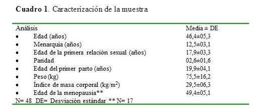 En el Cuadro 1 se puede observar las características generales de estas pacientes; como puede verse en cuanto a algunos caracteres clínicos investigados se evidenció que el promedio de la edad era de 46 años, la edad de la menarquía y de la primera relación sexual fue alrededor de los 12 y 17 años de edad, con una paridad entre 2 y 3 hijos, habiendo sido el primer parto a la edad de 19 años; asimismo, se detectó que la mayor parte de la mujer tenía sobrepeso u obesidad y del total de participantes 17 eran posmenopáusicas, habiendo presentado la menopausia a los 49 años en promedio. Por otra parte, sólo 17 % (n= 8) pacientes presentaron el antecedente familiar de cáncer (5 de mama, 2 de ovario y 1 de endometrio); 58,3 % (n=28) manifestaron haber consumido anticonceptivos orales; en tanto que el habito tabáquico representó el 33,3 % (n= 16) y el consumo excesivo de café y alcohol se evidenció en 43,8 % (n= 21) y 14,6 % (n= 7).