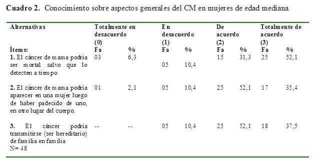 En el Cuadro 2 se mide el conocimiento general que tienen la mujeres de edad mediana sobre el CM, se observa que más del 80 % de las respuestas se ubican entre de acuerdo y totalmente de acuerdo en los tres ítems utilizados para medir esta dimensión de la variable. De esta manera se obtuvo que la mayor parte de las encuestadas manifestaba estar totalmente de acuerdo con que el CM podría ser mortal (52,1 %), o estaban de acuerdo con que en algunos casos el CM puede aparecer secundario a otra neoplasia o podría ser hereditario (52,1 %, respectivamente).