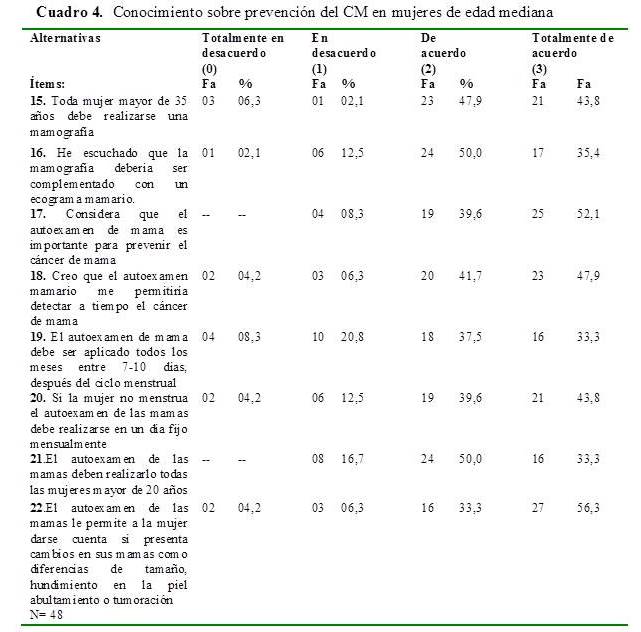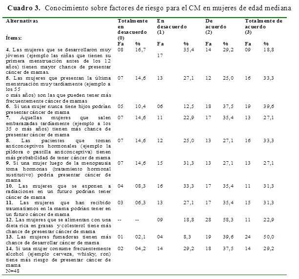 En el Cuadro 3 se identifica el nivel de conocimiento sobre los factores de riesgo asociado al cáncer de mama. En las mujeres estudiadas, destaca el poco conocimiento en un solo ítem (4), donde el puntaje para esta pregunta se ubica en las opciones totalmente en desacuerdo y en de acuerdo, en un porcentaje mayor del 50 %; así pues la mayoría de ellas manifestaban estar en desacuerdo que la menarquía precoz representaba un factor de riesgo para CM. En tanto que las demás ítems (5-14) mayoritariamente presentan un conocimiento alto; ubicándose entre las opciones, “de acuerdo” y “totalmente de acuerdo”, con puntajes que superan en estos ítems el 50 %.